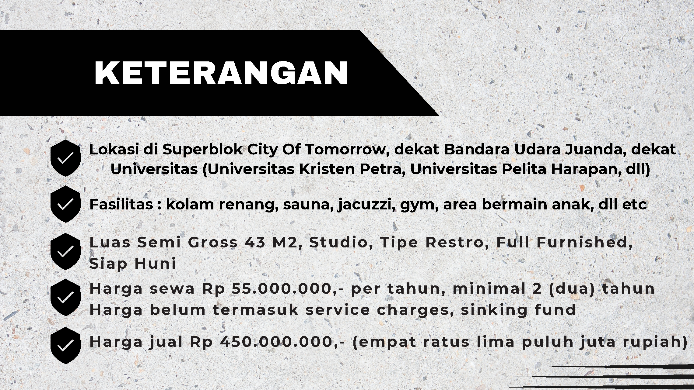- Fasilitas : Pool, Jacuzzi+Sauna, Gym, dll